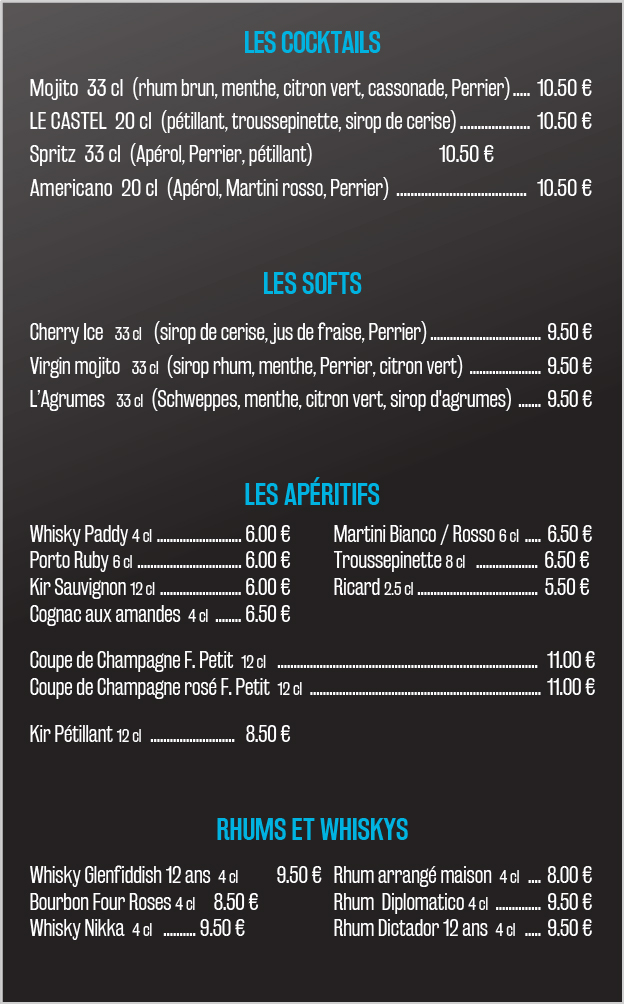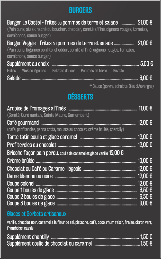 Et si vous terminiez votre repas par une note sucrée ? Après un délicieux moment à notre table, le CASTEL vous propose la carte de ses desserts pour finir agréablement votre déjeuner ou votre dîner. Dans notre établissement, nous avons à cœur de satisfaire toutes vos envies et en vous proposant des recettes savoureuses préparées avec des produits de saison.